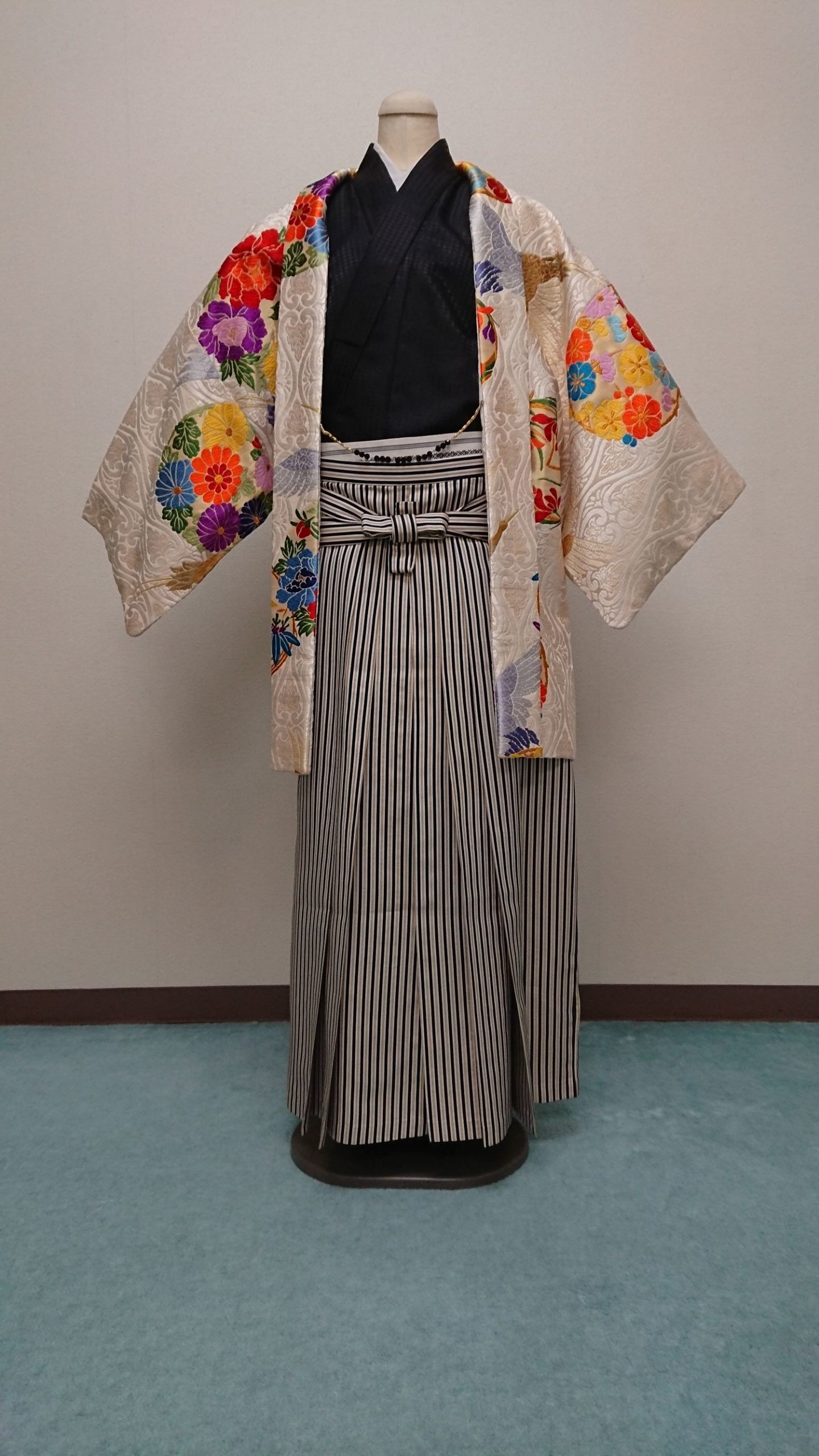 羽織+羽織の紐+着物+袴+下帯+長襦袢+半襟+腰紐+足袋+雪駄+白扇